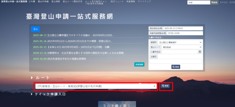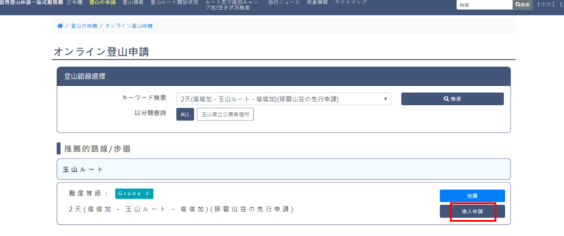 申請ページで日本語表記に変更するとなぜかHomeに戻ってしまったので、Homeからルートを検索しました。今回は小屋泊で玉山に行きたいので、「2天(塔塔加 – 玉山ルート – 塔塔加)(排雲山荘の先行申請)」を選択しました。